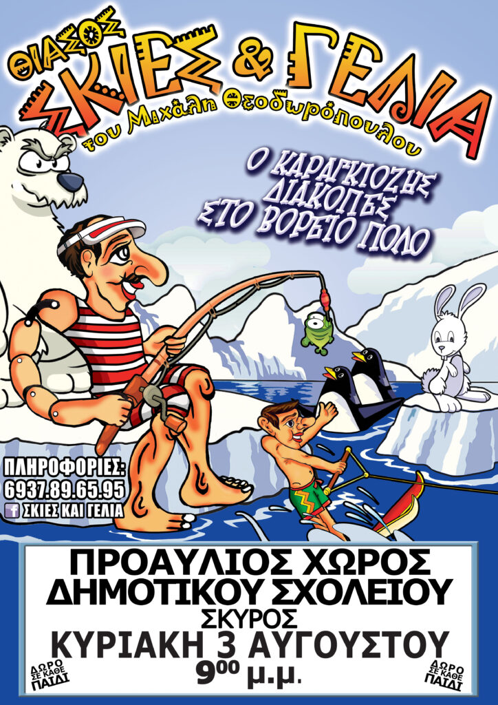 Ο θίασος του Μιχάλη Θεοδωρόπουλου “ΣΚΙΕΣ ΚΑΙ ΓΕΛΙΑ” παρουσιάζει την παράσταση «Ο ΚΑΡΑΓΚΙΟΖΗΣ ΔΙΑΚΟΠΕΣ ΣΤΟ ΒΟΡΕΙΟ ΠΟΛΟ». Μια καινούρια παράσταση, δημιουργία του καραγκιοζοπαίχτη Μιχάλη Θεοδωρόπουλου.