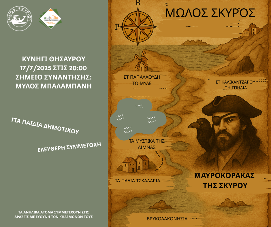 Σας προσκαλούμε σε μια μοναδική εκπαιδευτική και ψυχαγωγική δράση για παιδιά δημοτικού, με θέμα ένα πειρατικό κυνήγι θησαυρού στον παραθαλάσσιο οικισμό Μώλος στη Σκύρο.
